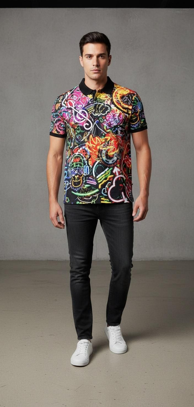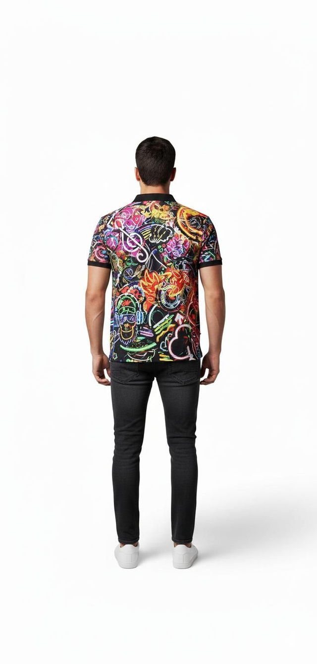 Unleash the energy. This polo shirt is a true statement piece, featuring a mesmerizing, all-over graphic print that captures the vibrant, luminous glow of a neon cityscape at night.