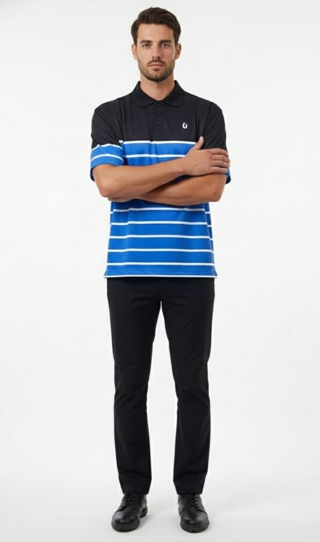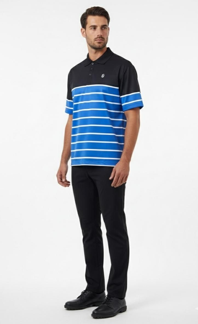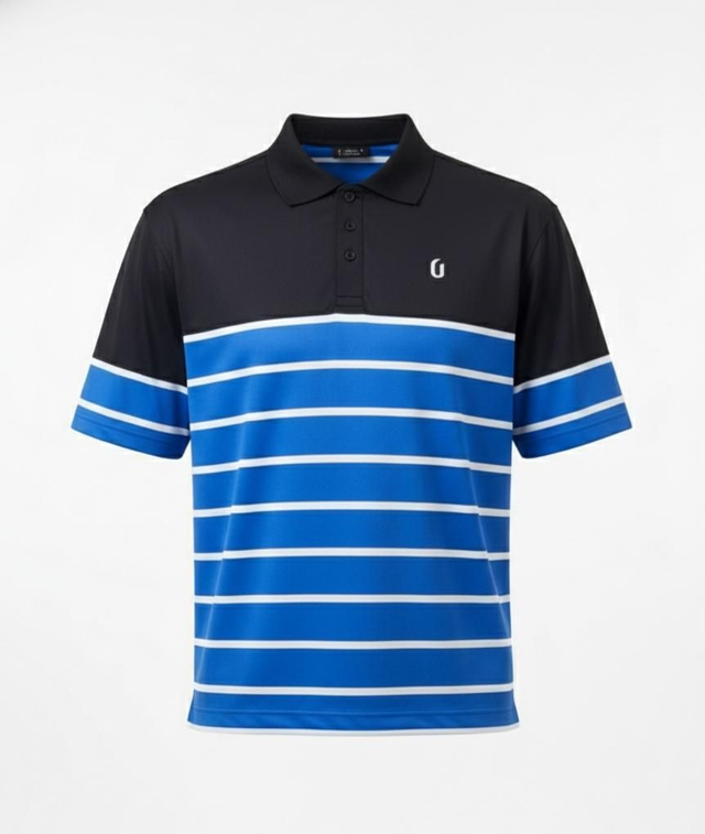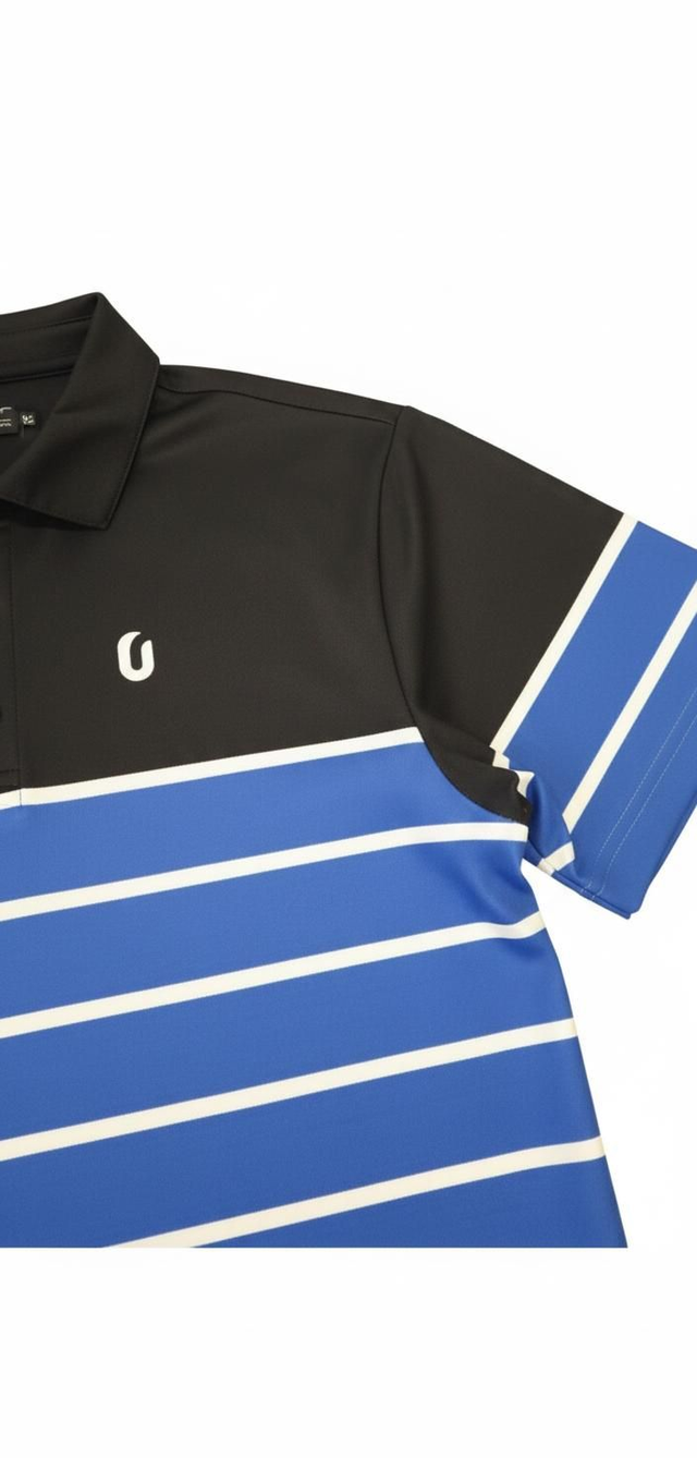 • ​Vibrant Design: A sophisticated mix of solid black shoulders and collar contrasting with electric blue and white horizontal stripes across the chest.