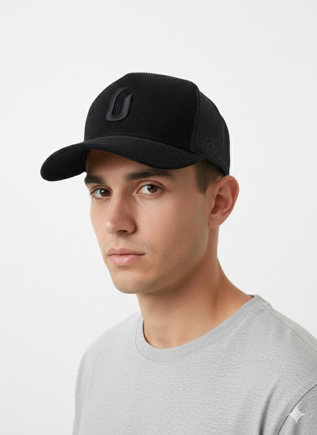 Elevate your everyday style with our Essential Black Corduroy Trucker Cap. A versatile style staple that brings a touch of premium texture to any casual look.